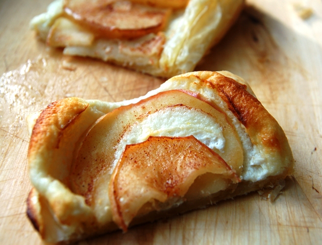 Orkaitę įkaitinkite iki 225 C temperatūros. SUmaišykite kreminį sūrį, kiaušinį ir cukrų. Šiuo mišiniu aptepkite tešlos lapelius. Gerai nuplaukite vaisius ir supjaustykite juos plonomis riekelėmis. Jums patiems spręsti ar norite nulupti vaisius ar ne. Vaisių riekeles išdeliokite ant tešlos lapelių. Apibarstykite cukrumi ir cinamonu. Kepkite apatinėje orkaitės dalyje apie 20 min. Skanaus!